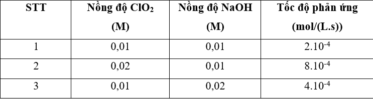 Tốc độ phản ứng được viết như sau: \(v = k.C_{Cl{O_2}}^x.C_{NaOH}^y\). Thực hiện phản ứng với những nồng độ chất đầu khác nhau và đo tốc độ phản ứng tương ứng thu được kết quả trong bảng sau: