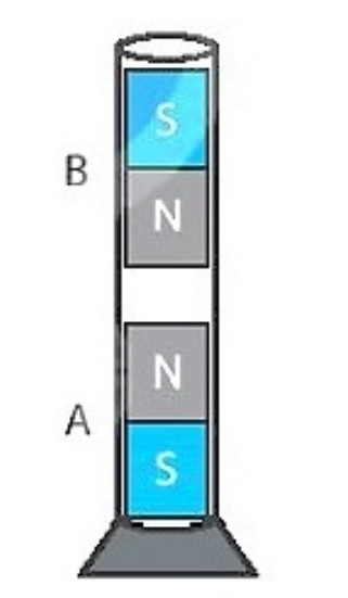 Quan sát hai thanh nam châm đặt trong ống thủy tinh ở hình vẽ. Tại sao thanh nam châm B lại lơ lửng phía trên thanh nam châm A?