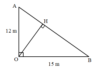 \(\begin{array}{l}A{B^2} = O{A^2} + O{B^2} = {12^2} + {15^2} \Rightarrow AB = \sqrt {369}  = 3\sqrt {41} \,\,\left( m \right)\\OH = \dfrac{{OA.OB}}{{AB}} = \dfrac{{12.15}}{{3\sqrt {41} }} = \dfrac{{60}}{{\sqrt {41} }}\,\,\left( m \right)\end{array}\)