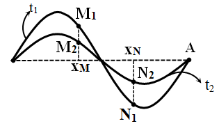 Áp dụng công thức độc lập với thời gian cho 2 điểm M, N tại haia thời điểm t1, t2, ta có: