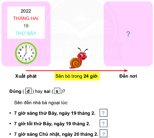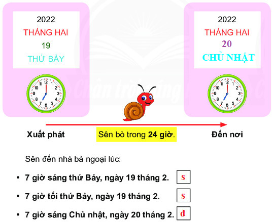 b) Ta có: 1 ngày = 24 giờ. Do đó, nếu bạn Sên xuất phát từ nhà lúc 7 giờ sáng thứ Bảy, ngày 19 tháng 2 để đến nhà bà ngoại thì bạn Sên sẽ đến nhà bà ngoại lúc 7 giờ sáng chủ nhật ngày 20 tháng 2.