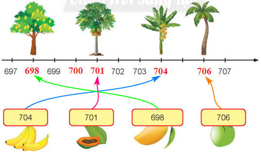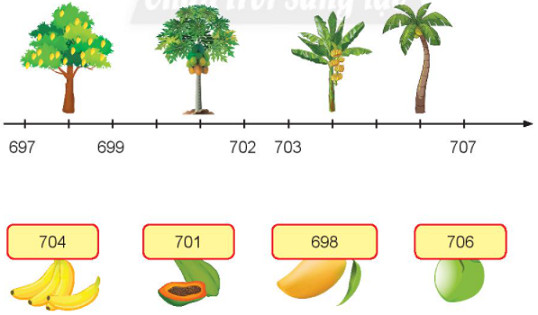 Quan sát tia số đã cho ta thấy khoảng cách giữa hai vạch của tia số là 1 đơn vị, đo đó ta đếm thêm 1 đơn vị (so với số bên trái) rồi điền các số thích hợp với mỗi cây, sau đó nối với thẻ số tương ứng.