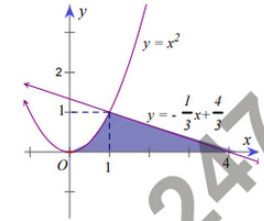 Tính thể tích vật thể tròn xoay ( phần tô đậm) quay quanh trục hoành giới hạn bởi các đường \(y = {x^2}\), \(y = – \frac{1}{3}x + \frac{4}{3}\) và trục hoành như hình vẽ.
