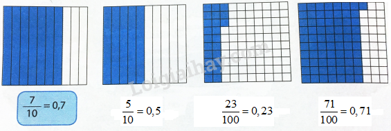– Trong mỗi hình, số phần được tô màu là tử số của phân số thập phân.