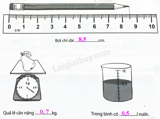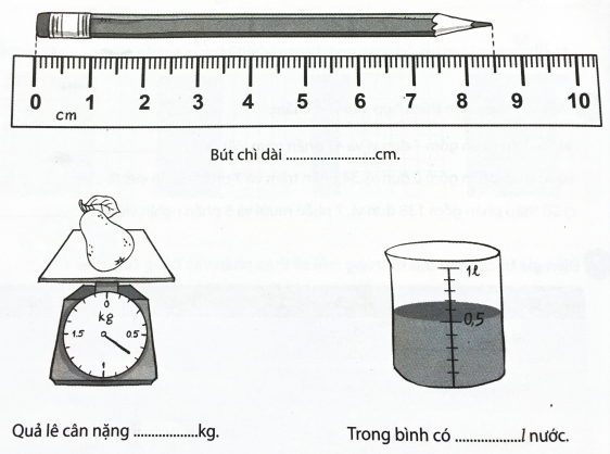 Quan sát hình vẽ, em xác định độ dài bút chì, cân nặng quả lê số lít nước có trong bình.