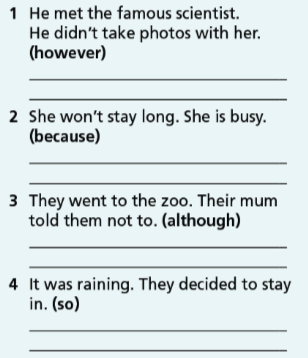 64. Choose the correct answer. 65. Put the verbs in brackets into the Present Simple or the Present Continuous. 66. Put the verbs in brackets into the Past Simple. 67. Put the verbs in brackets into the Future Simple or be going to. 68. Put the verbs in brackets in the correct tense. 69. Fill in each gap with and, or or but. 70. Fill in each gap with so or because. 71. Fill in each gap with although or however. 72. Join the sentences using the words in brackets.