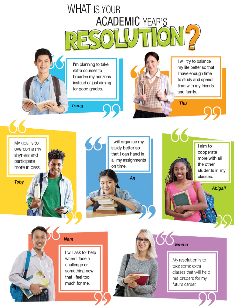 WHAT IS YOUR ACADEMIC YEAR’S RESOLUTION? Trung: I’m planning to take extra courses to broaden my horizons instead of just aiming for good grades. Thu: I will try to balance my life better so that I have enough time to study and spend time with my friends and family. Toby: My goal is to overcome my shyness and participate more in class. An: I will organise my study better so that I can hand in all my assignments on time. Abigail: I aim to cooperate more with all the other students in my classes.
