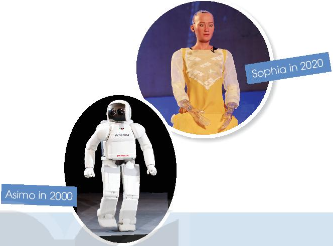 Năm 2000, Asimo, một người máy do Honda tạo ra, đã khiến mọi người kinh ngạc khi vừa bước xuống cầu thang. Hai mươi năm sau, một người máy tên là Sophia thậm chí có thể giao tiếp với con người bằng cách sử dụng ngôn ngữ của con người và thể hiện cảm xúc.