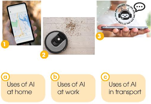 1. Look at the pictures of Asimo and Sophia and discuss the questions below in pairs. 2. Read the text below and choose the best title for it. 3. Read the text again and match the pictures with the uses of AI. 4. Decide whether the following statement are true (T) or false (F). 5. Work in groups and discuss how AI can be used in schools. Then share your ideas with the whole class.