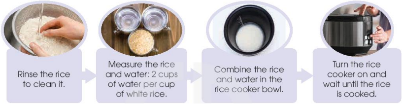(Làm việc theo cặp. Đọc các bước nấu cơm trong nồi cơm điện. Sử dụng mô hình trong phần 2 và các mẹo ở trên để đưa ra hướng dẫn.)