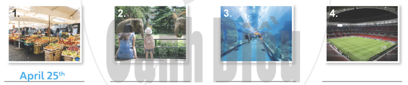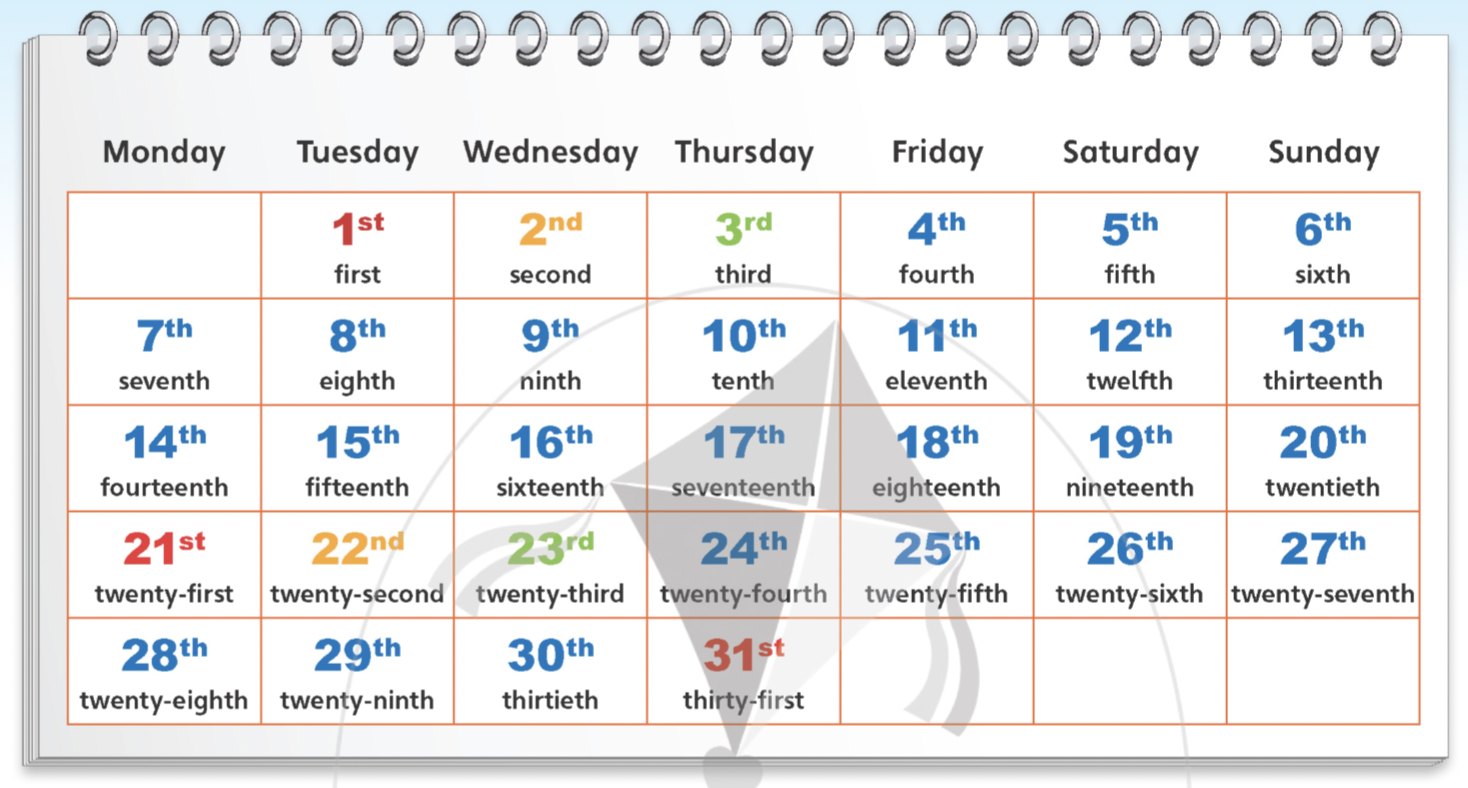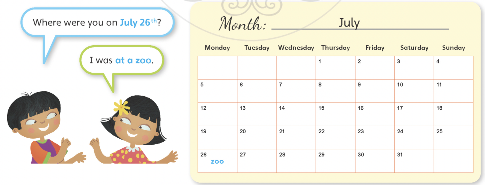 Look and listen. Repeat. Listen and point. Say. Look. Listen and write. Make your calendar. Ask and answer.
