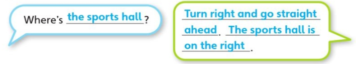 Turn right and go straight ahead. The sports hall is on the right. (Rẽ bên phải và đi thẳng. Nhà thi đấu ở phía bên phải.)