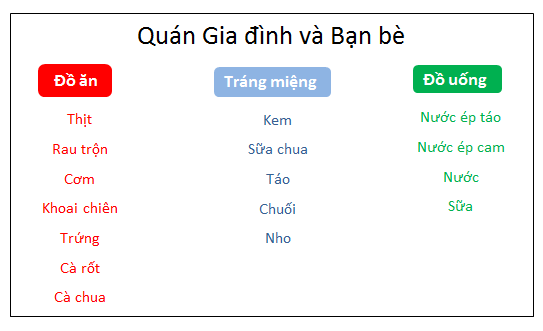 (Hãy nhìn vào thực đơn. Tôi thích thịt và cơm. Tôi cũng thích sữa chua và nước ép táo, nhưng tôi không thích sữa.)