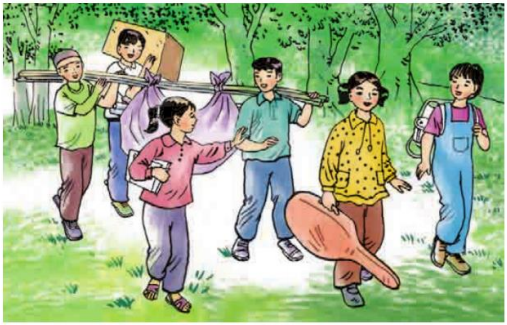 Chúng tôi đang hành quân tới nơi cắm trại – một thắng cảnh của đất nước. Bạn Lệ đeo trên vai ba lô con cóc, hai tay vung vẩy, vừa đi vừa hát véo von. Bạn Thư điệu đà xách túi đàn ghi ta. Bạn Tuấn “đô vật” vai vác một thùng giấy đựng nước uống và đồ ăn. Hai bạn Tân và Hưng to, khỏe cùng hăm hở khiêng thứ đồ lỉnh kỉnh nhất là lều trại. Bạn Phượng bé nhỏ nhất thì kẹp trong nách mấy tờ báo Nhi đồng cười, đến chỗ nghỉ là giở ra đọc ngay cho cả nhóm nghe.