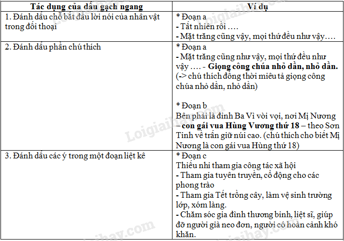 Dựa vào kiến thức đã học ở lớp 4 và các ví dụ dưới đây, hãy lập bảng tổng kết về tác dụng của dấu gạch ngang: