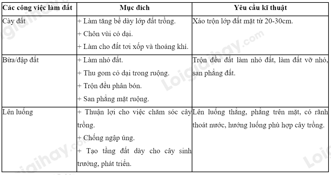 Làm đất là khâu kĩ thuật quan trọng có tác dụng làm đất tơi xốp, tăng khả năng giữ nước, chất dinh dưỡng, đồng thời diệt cỏ dại và mầm mống sâu, bệnh, tạo điều kiện cho cây sinh trưởng, phát triển tốt. Làm đất gồm các công việc sau: cày đất, bừa/ đập đất, lên luống.