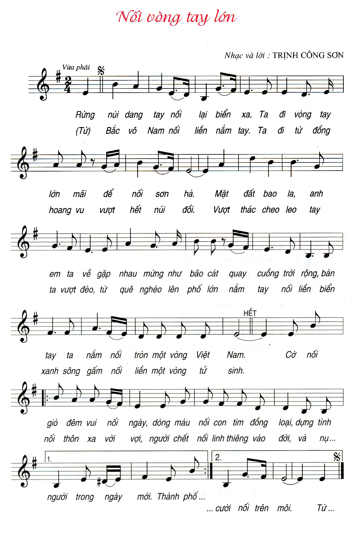 Bài hát Nối vòng tay lớn của nhạc sĩ Trịnh Công Sơn được viết ở nhịp 2/4 giọng Mi thứ. Với nhịp điệu vừa phải bài hát là tiếng nói tình cảm của những người Việt Nam yêu nước, mong muốn cùng nắm tay nhau để tạo dựng cuộc sống bình yên, thanh bình vươn tới mục tiêu cao cả vì một đất nước Việt Nam thống nhất, độc lập, hòa bình, hạnh phúc.