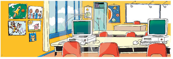 Những cái bàn thì dài. Có hai cái bảng và hai cái máy tính. Có những tấm tranh quảng cáo to ở trên tường. Cũng có rất nhiều bức tranh nữa. Cô giáo của tôi là cô Lan. Tôi thích cô ấy.