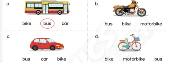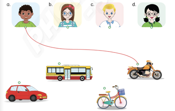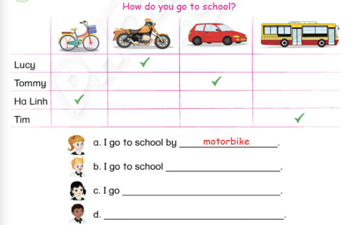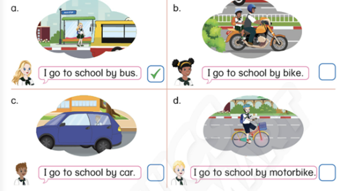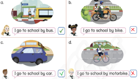 d. I go to school by motorbike. (Tôi đi đến trường bằng xe máy.)