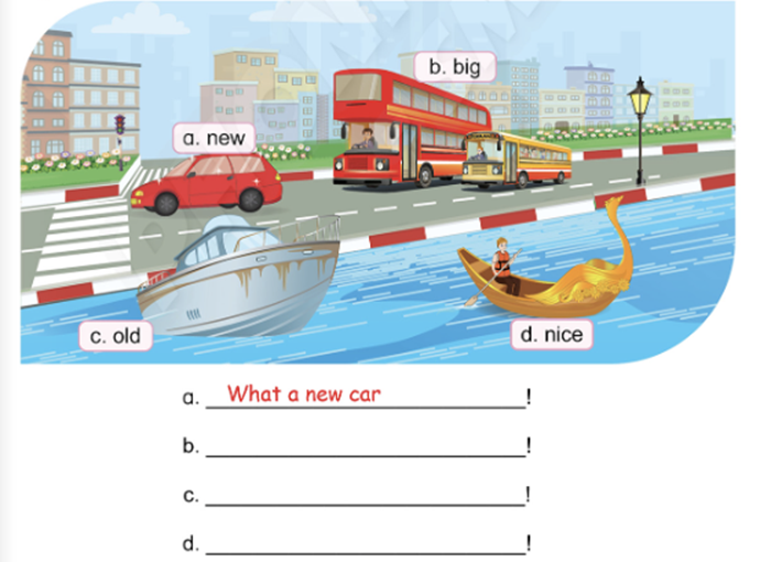 d. What a new car! It’s red. (Đúng là một chiếc ô tô mới! Nó màu đỏ.)