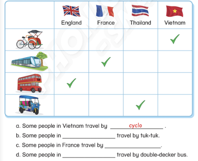 a. Some people in Vietnam travel by cyclo. (Một số người ở Việt Nam di chuyển bằng xích lô.)