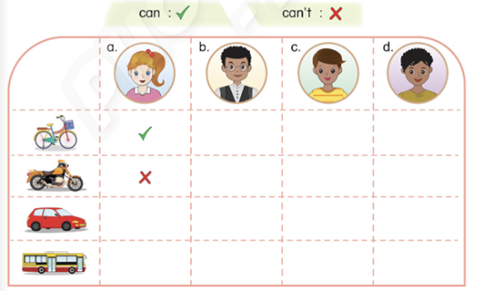 – No, I can’t. I can ride a motorbike. (Tôi không thể. Tôi có thể đi xe máy.)