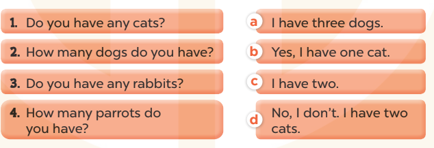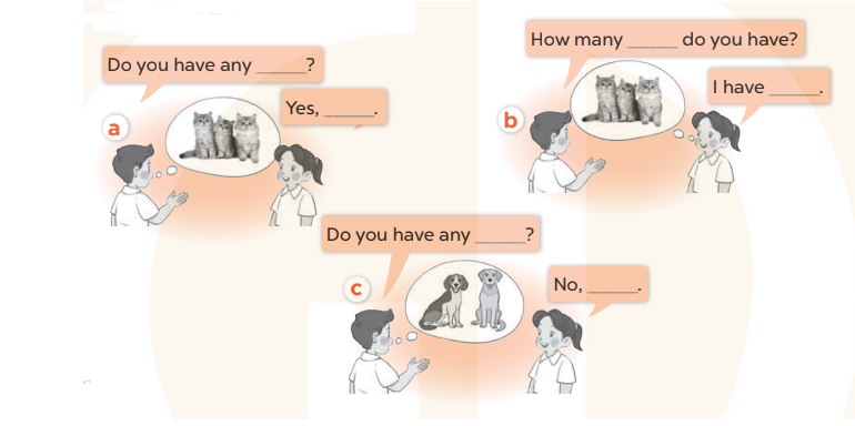1. A: Do you have any cats? (Bạn có con mèo nào không?)