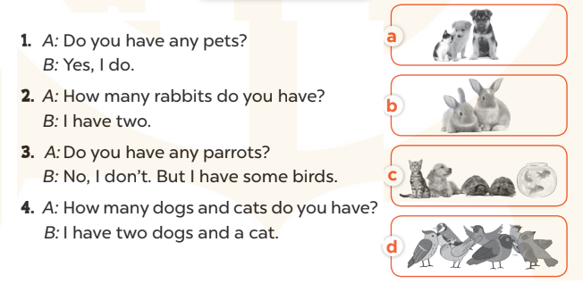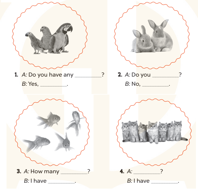 1. A: Do you have any parrots? (Bạn có con vẹt phải không?)