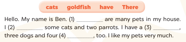 Hello. My name is Ben. There are many pets in my house. I have some cats and two parrots. I have a goldfish, three dogs and four cats, too. I like my pets very much.