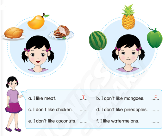 a. I like chicken. I don’t like coconuts. (Tôi thích thịt gà. Tôi không thích quả dừa.)