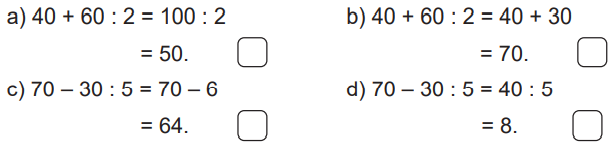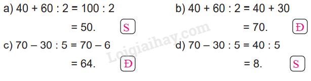 – Kiểm tra cách tính giá trị biểu thức trong mỗi câu rồi điền Đ, S cho thích hợp.