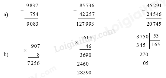 Đặt tính rồi tính. a) 9 837 – 754 Không thực hiện phép tính, hãy viết số thích hợp vào ô trống.