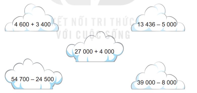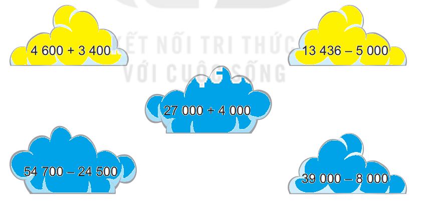 Tô màu xanh vào những đám mây ghi phép tính có kết quả lớn hơn 30 000, màu vàng vào những đám mây ghi phép tính có kết quả bé hơn 9 000.