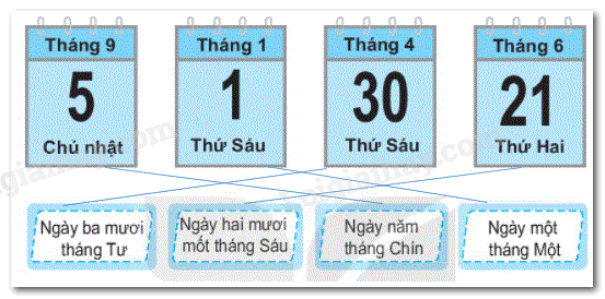 Quan sát ngày, tháng ghi trên mỗi tờ lịch rồi nối với cách đọc tương ứng.