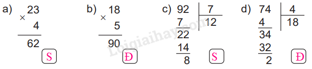 Kiểm tra cách đặt tính rồi tính ở mỗi phép toán, nếu đúng ghi Đ, sai ghi S.
