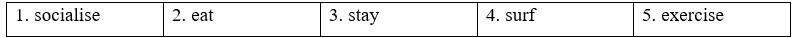 2. Fill in each gap with exercise, socialise, surf, eat or stay.