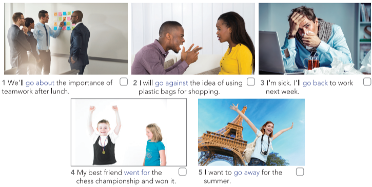1. Look at the pictures and read the examples. Which situation have you experienced? Tick (✔) next to the examples. 2. Read and match the phrasal verbs with their meanings. 3. Choose the correct preposition to complete the sentences. 4. In groups, find someone who…. 5. Summarize your group's findings in Exercise 4 and present these findings to the class.