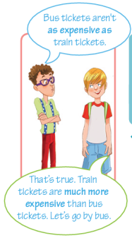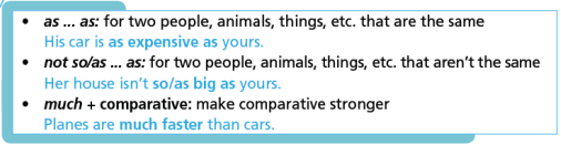 1. Choose the correct option. 2. Complete the sentences using as … as or not so/as … as. 3. Form complete sentences using much + comparative. 4. Compare places in your town/city with your partner. Use as… as, not so/as … as or much + comparative. 5. Choose the correct option. 6. Complete the gaps with like, the same as or different from. 7. Use like, the same as or different from to make sentences about people, things or places in the areas you live in.