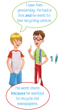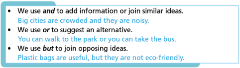 1. Complete the sentences with and, or or but. 2. Rewrite the sentences using the words in brackets. 3. Start a sentence. Your partner completes it using so or because. 4. Join the sentences using the words in brackets. 5. Fill in each gap with and, or, but, so, because, although or however. 6. Start or say a sentence. Your partner continues using although or however.
