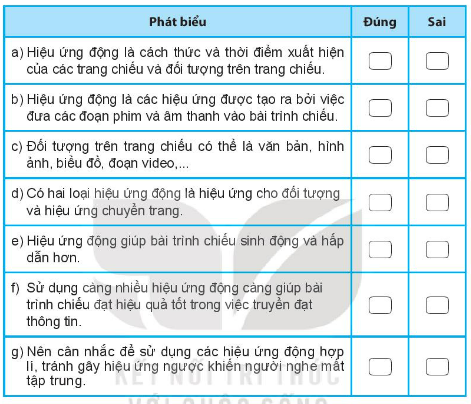 Đánh dấu X vào cột Đúng/Sai tương ứng.