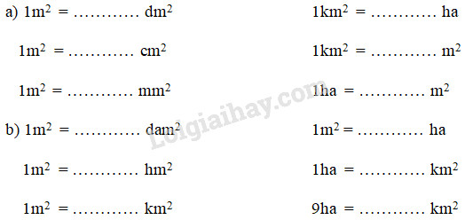 Dựa vào lý thuyết đã học về các đơn vị đo diện tích để hoàn thành bảng đã cho.