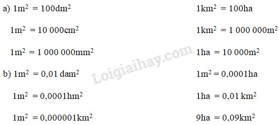 b) Trong bảng đơn vị đo diện tích :
