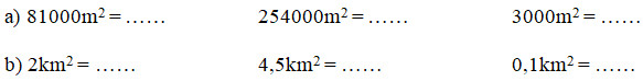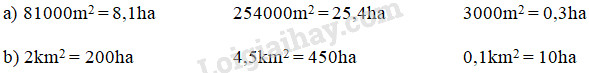 Áp dụng cách chuyển đổi:    \(1km^2 = 100ha\)  ;    \(1ha = 10\; 000m^2\).