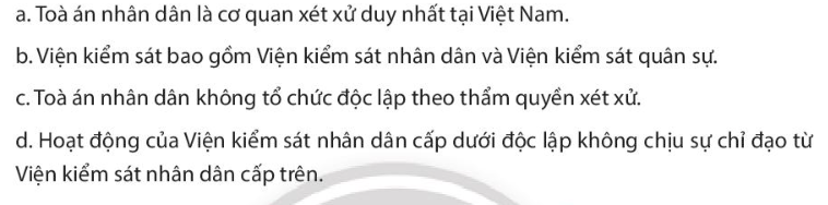d – Em không đồng tình với ý kiến trên vì hoạt động của Viện Kiểm sát nhân dân cấp dưới phải chịu sự chỉ đạo của Viện Kiểm sát nhân dân cấp trên.