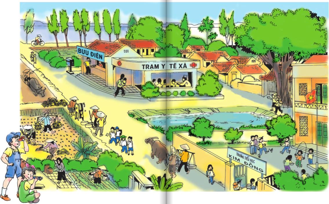 –   Em nhìn thấy con đường chính trước đường có Trường tiểu học Kim Đồng, có bưu điện và trạm y tế xã.