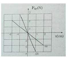 Hai con lắc lò xo nằm ngang dao động điều hòa dọc theo hai đường thẳng song song kề nhau và song song với trục Ox. Hai vật nặng có cùng khối lượng. Vị trí cân bằng của hai dao động đều nằm trên một đường thẳng qua gốc tọa độ và vuông góc với trục Ox. Đồ thị (1), (2) lần lượt biểu diễn mối liên hệ giữa lực kéo về Fkv và li độ x của con lắc 1 và con lắc 2. Biết tại thời điểm t, hai con lắc cùng qua vị trí cân bằng theo cùng một chiều. Sau đó một khoảng thời gian ngắn nhất bằng 0,5s con lắc 1 có động năng bằng một nửa cơ năng của nó, thì thế năng của con lắc 2 khi đó có giá trị gần nhất với giá trị nào sau đây?