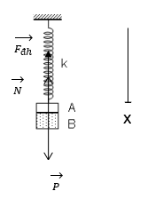 Chiếu theo phương thẳng đứng hướng xuống dưới ta có:    \(mg{\rm{ }}-{\rm{ }}k.{x_0}{\rm{ }}-{\rm{ }}N{\rm{ }} = {\rm{ }}ma\)