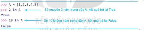 – Kiểm tra một phần tử có nằm trong một danh sách không: Câu lệnh dùng toán tử in. Nếu có trả lại True, nếu không thì trả về False.