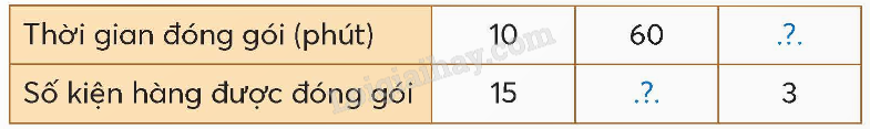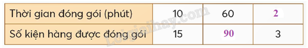 Cho biết một chiếc máy tự động, cứ 10 phút lại đóng gói được 15 kiện hàng. Hãy hoàn thiện bảng dưới đây.