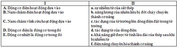 Ta có, các nội dung cột ghép tương ứng với các nội dung cột II là: